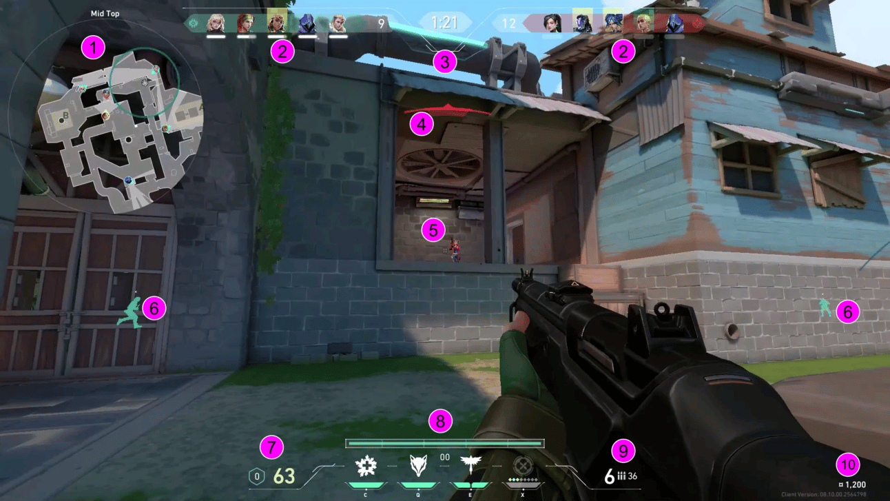 The Mini Map - It shows where you are on the map, your teammates in green, opponents in red, as well as the Spike sites (A, B, or C)